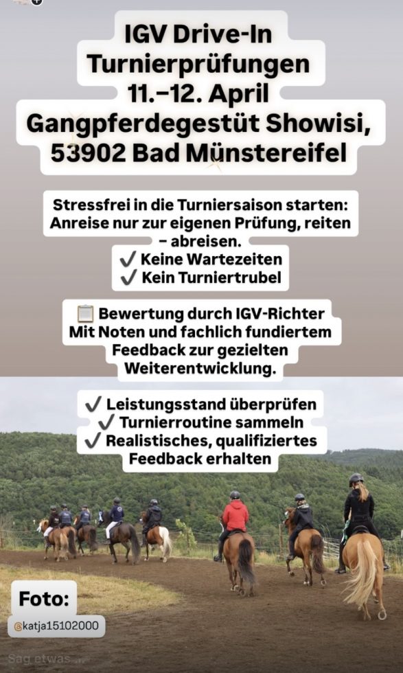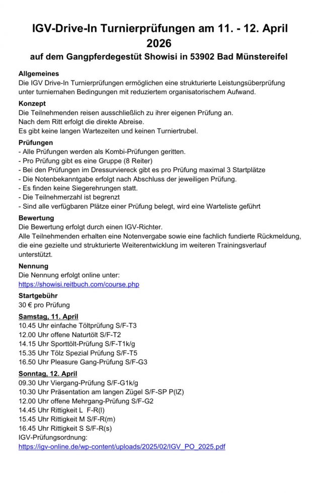 IGV-Drive-In TurnierprüfungenStressfrei in die Turniersaison starten:+ Zu Google Kalender hinzufügen+ iCal / Outlook export Datum11. - 12.04.2026 Uhrzeit 10:00 - 17:00 VeranstaltungsortGangpferdegestüt ShowisiFuhrweg 44, 53902 Bad Münstereifel Kategorie Sonstiges TurniereVeranstalter Dr. Stefanie Stöcker